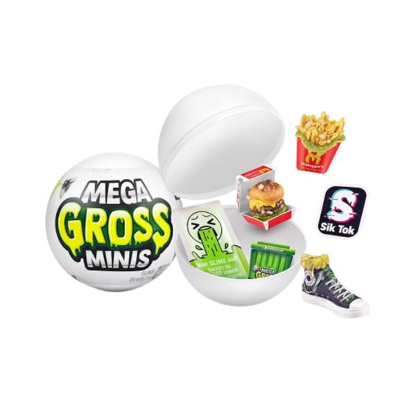 - Peel and Reveal this crusty capsule to discover 5 Gross surprises! Each capsule holds 3 Mega Gross Minis, stickers, collector’s guide and a slime barf bag.